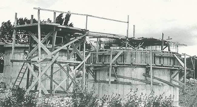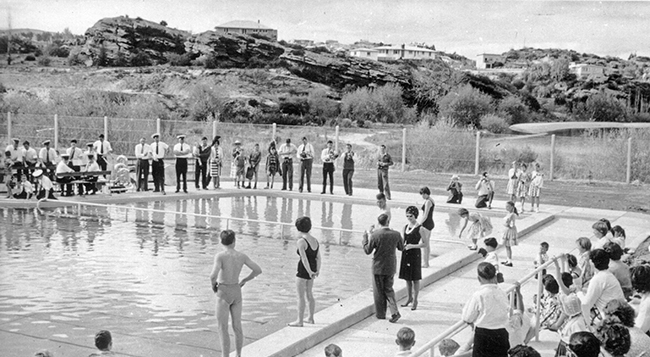 The pool walls were tilt-slab constructed on the pool floor which was a first. The walls were lifted into place with a converted Tea Ferguson farm tractor. Charlie Breen did the building, and J.D. Watt was the engineer.