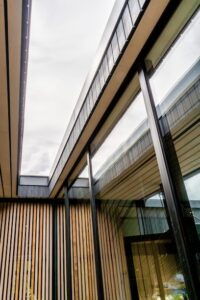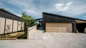 The building is clad in two tonnes of Abode timber cladding, along with cast in-situ concrete to enhance the natural tones. Louvres on windows are used to manage solar gain and create privacy for the client while also offering a striking feature.