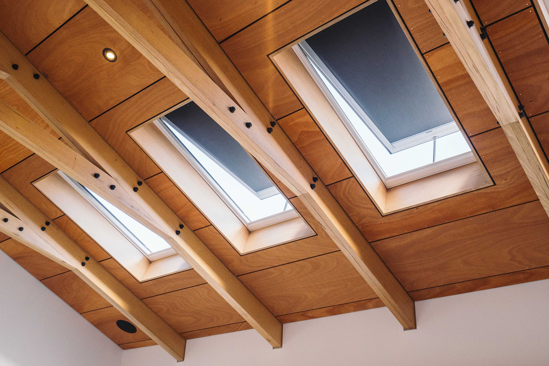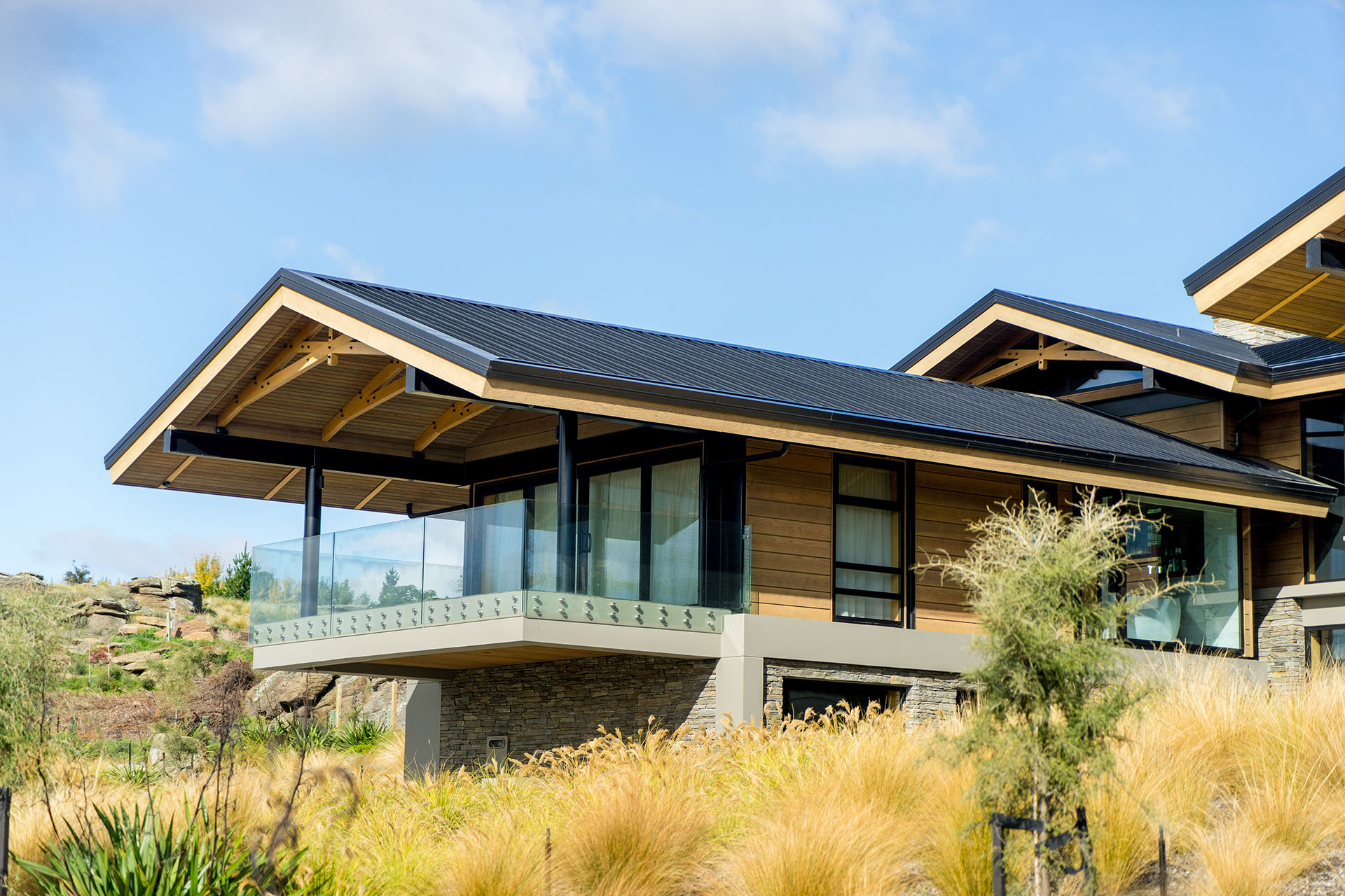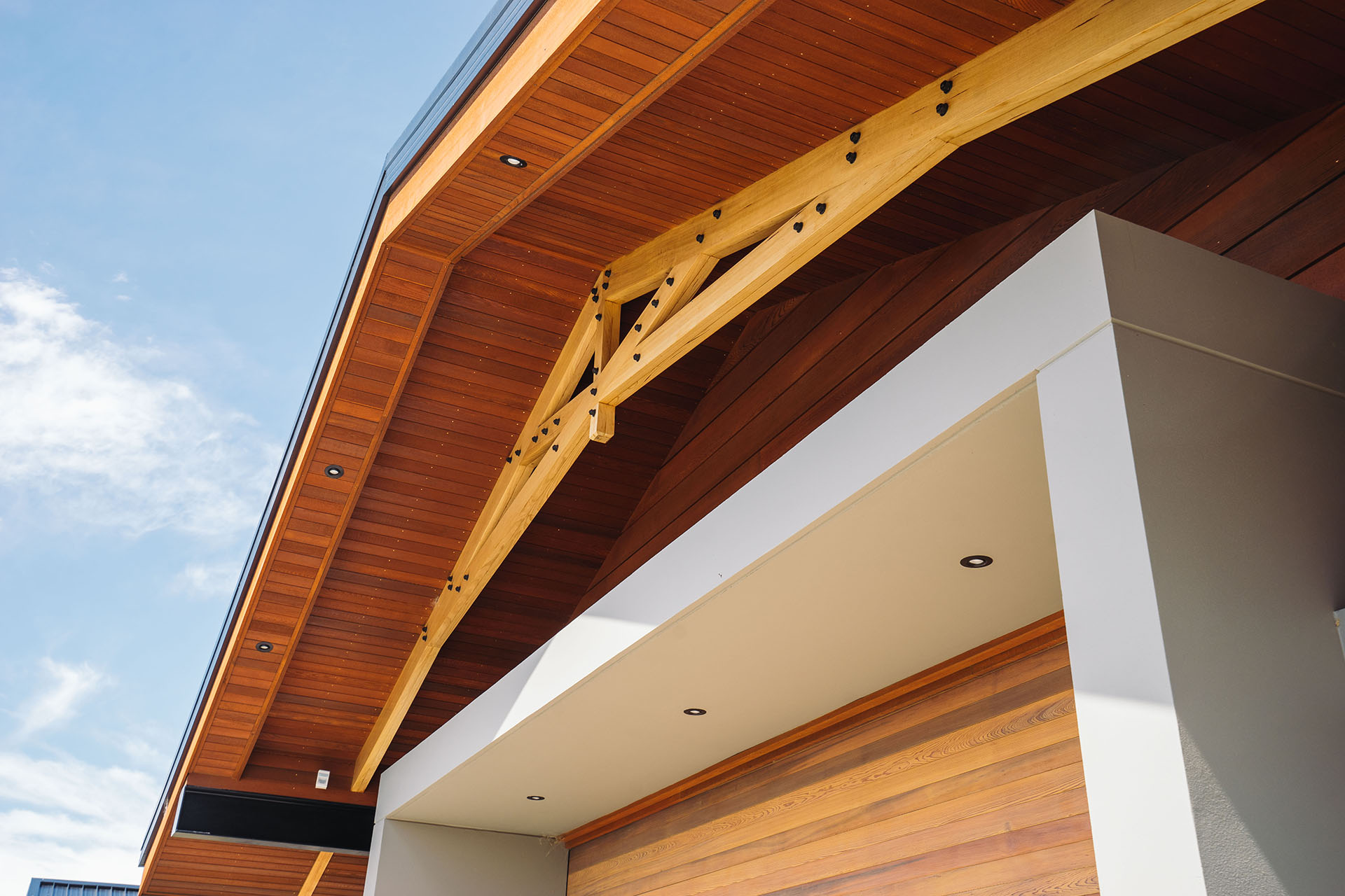 The technical structure was built with a combination of both steel and traditional wood framing and featuring complex engineering. Stand-out features include cantilevered decks and roofs, along with exposed hardwood and Tasmanian Oak laminated trusses – all specifically made by Breen for the job.
